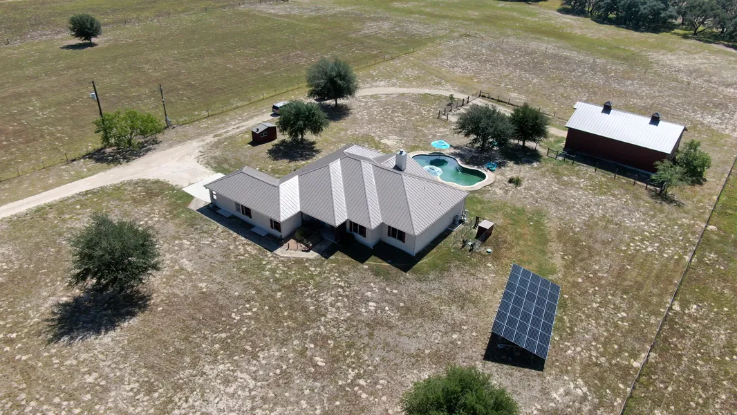 Step into this exclusive, Chillmark custom built 4 Bed/2.5 Bath, One-story residence, perfectly located on a 4.161 acre tract with a 1728 square foot Pacific NW Douglas Fir Style wood barn, 40'x25.5' Keith Zars pool, 35 panels of 345 W SunPower ground solar, and a Cedar well house with a metal roof. In addition, there is an office space which could be converted to a 5th bedroom if needed. This cozy home welcomes you in with a spacious open floor plan, separate dining room with an abundance of natural light and 48"x12" Italian porcelain tile throughout. Did I mention there is a gorgeous Eat-in Island kitchen with plenty of natural wood cabinet space and room to gather around and entertain? The focal points of the living room are the exposed wooden beams and the French doors that lead out onto a flagstone patio that overlooks the pool and barn. There is a 2021 Kinetico water filtration system with the well and kitchen has RO for safe drinking water. The American Standard 20 SEER Platinum HVAC system was installed in 2021, and the house comes equipped with a central vacuum system. The outdoor spaces include mature Oak trees that are dispersed throughout the property and surround the pool for a nice shaded area, and the barn is something that you have to see to believe. It is not your typical metal barn, rather a completely constructed wood barn with high ceilings and a cupola. There is so much to see with this property, you really need to come and see it to believe it. Don't miss out on this gem in South Texas - make an appointment today!