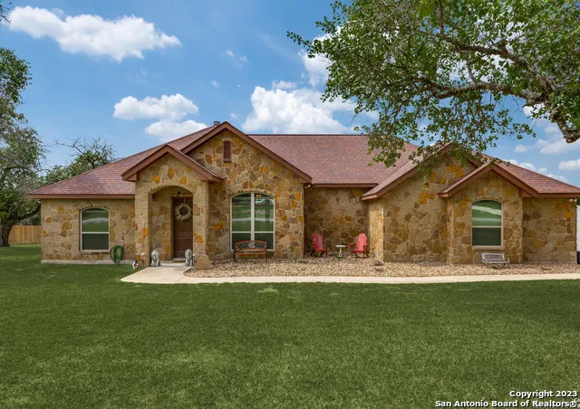 This beautiful custom-built home in highly sought after Eden Crossing is a true gem. The all-rock spacious three-bedroom, 2.5-bath home with media/flex room, high ceilings, and granite countertops is a perfect combination of luxury and functionality. The tile floors throughout the home look like wood, adding to its beauty and durability. The home features two dining areas, a side entry two-car garage, and underground utilities, making it a perfect choice for those who value quiet country living with easy access to San Antonio. The home is located in the desirable La Vernia School District, making it an ideal choice for families with school-going children. As you step inside, the open-concept floor plan with high ceilings creates an airy and welcoming atmosphere. The stone accents surround the fireplace and can be found throughout the home, adding to its beauty and charm. The grand kitchen is a chef's dream with gorgeous wood cabinetry, stainless steel appliances, including double ovens, and sprawling granite countertop prep space. Whether you're cooking dinner for one or entertaining guests, this kitchen has everything you need. The primary bedroom is a luxurious retreat with coffered ceilings, a lavish en-suite bath, an oversized wrap-around tile shower, and dual vanities. The two additional bedrooms offer plenty of options for customization to fit your needs. Outside, the backyard has ample space to create your own private oasis where you can enjoy the peaceful surroundings of the neighborhood or ride your golf cart down to the hidden pond. This home in Eden Crossing is a perfect choice for those who value serene and peaceful living in a beautiful and spacious home. Don't miss out on the opportunity to make this dream home yours today!