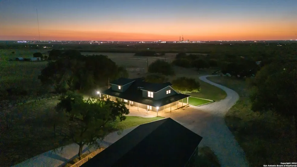 Amazing opportunity to experience the peacefulness of the country with the convenience of a short commute to the city! 2024 RENOVATION OF PRIMARY HOME, GUEST HOUSE AND NEWLY CONSTRUCTED 30' X 60' ENCLOSED METAL BUILDING! Located in the award winning La Vernia Independent School District, this property is not just a home, it's a lifestyle. Large primary home, guest house and outbuilding, this stunning property has something for everyone. It features a spacious main residence meticulously rebuilt from the studs, showcasing every modern amenity. With close to 3,300 s/f of living space, this home boasts an open floor plan with two master suites-one on each level-allowing for versatile living arrangements. Step inside to discover a huge kitchen that is a chef's paradise. It features solid wood cabinetry, a striking zellige tile backsplash, and expansive quartz countertops with a generous island. Equipped with stainless steel appliances, a 36" commercial gas range, two dishwashers, and a deep one-basin sink, this kitchen is designed for both everyday meals and grand gatherings. A butler's pantry adds an extra touch of convenience, providing ample storage for your smaller appliances and prep space. The home also features two inviting living areas, perfect for relaxation and entertainment, a relaxing fireplace, and as well as beautifully vaulted ceilings, with tongue-and-groove shiplap, adding warmth and character throughout. Outside, a wrap-around porch invites you to take in the breathtaking views that extend all the way to San Antonio. The expansive 2 bedroom, 1,100 square-foot guest house includes an attached two-car garage, providing comfortable accommodations for friends or guests. Need more space? The property features a 30'x60' enclosed metal building with a 200-amp service and an extended 20'x60' covered area, ideal for hobbies, business or storage. This building includes a separate office space with HVAC and is plumbed for a bathroom-perfect for work or play. Every inch of this home has been carefully upgraded with new windows, plumbing, electrical systems, roof, and two HVAC units, ensuring comfort and peace of mind. With the entire property fenced in for privacy and security, this is a must-see home! Too many features to list-experience it in person and fall in love with country living at its finest!
