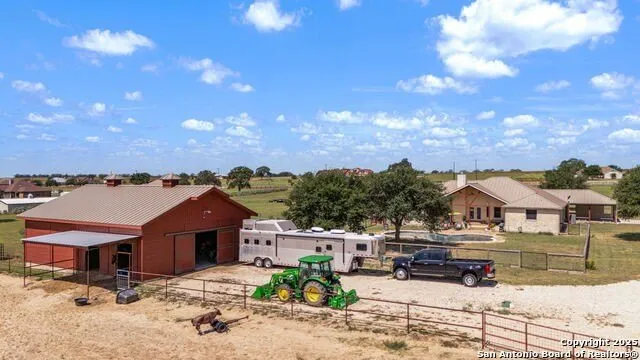 Equestrian Paradise in Triple R Ranch and Floresville ISD: For the discerning horse Enthusiast, this property offers the perfect balance of country living, equestrian amenities, and modern comfort. Nestled on 4.161 gated acres in the peaceful Triple R Ranch community, this meticulously maintained 4-bedroom, 2.5-bath custom home provides 2,576 sq. ft. of single-story living designed with both function and charm. At the heart of this property is a 1,728 sq. ft. Pacific Northwest Douglas Fir-style barn-featuring two horse stalls, a covered lean-to, 35-amp RV hookup, and full electrical. Whether you envision a riding arena, workshop, or event space, the possibilities are endless. Wide-open acreage provides plenty of room for grazing, training, and enjoying the equestrian lifestyle you've been dreaming of. Beyond the barn, enjoy a refreshing Keith Zars pool surrounded by a large flagstone patio and shaded by mature oaks, perfect for winding down after a ride or hosting gatherings. Inside, the home greets you with rustic elegance: soaring ceilings with wooden beams, a rock fireplace, Italian porcelain tile, and abundant windows that fill the space with natural light. The island kitchen with custom wood cabinetry and reverse osmosis system connects seamlessly to the formal dining and living spaces-ideal for family living or entertaining. The flexible layout includes four bedrooms plus a dedicated office (or optional fifth bedroom), with private patio access from the primary suite. Energy-efficient upgrades include a 2021 American Standard 20 SEER Platinum HVAC, 35 ground-mounted SunPower solar panels, and a Kinetico water filtration system. Part of the highly regarded Floresville ISD with school bus service available, this gated estate blends convenience with privacy. If you've been searching for a true horse property that doesn't compromise on comfort or style, this is the one.