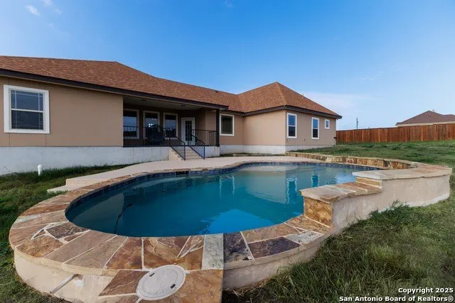 **$20,000 Price Reduction!** Welcome to your private oasis in the heart of La Vernia! This beautifully designed 4-bedroom, 3.5-bathroom home is nestled on 1.03 acres in a peaceful, established neighborhood-offering a rare blend of style, comfort, and space both inside and out. Step inside to find a bright, open-concept layout filled with designer touches and smart functionality. Tile flooring flows throughout the home, complemented by thoughtful ceiling and window details that add warmth and character. The heart of the home-the kitchen-shines with a large stainless steel basin sink, oversized pantry, pot filler, and stacked rock accents that mirror the home's exterior and bring a touch of rustic charm indoors. The center island doubles as a stylish focal point and gathering space. Each bedroom is generously sized, while two primary suites offer flexibility for guest accommodations. The custom primary closet provides built-in organization, and the en suite bath is a spa-like retreat featuring double vanities and a beautifully tiled walk-in shower. Step outside to your oversized covered patio, the perfect spot for morning coffee or evening entertaining. Just beyond, a sparkling in-ground pool awaits-set within a fully fenced backyard that offers complete privacy and plenty of room to relax or play. With an oversized 2-car garage, long driveway, and just minutes to shopping, dining, and schools, this home checks every box. Whether you're looking to escape the city or entertain in style, this is a place to truly label home!
