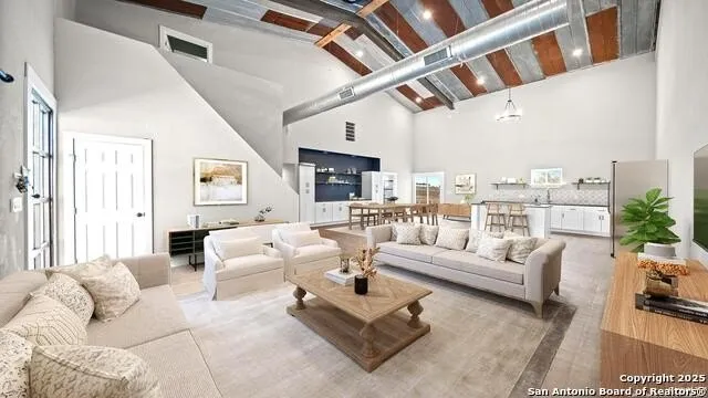 Discover the charm of the countryside with this expansive and contemporary barndominium situated on five acres within the highly desirable Lake Valley Estates subdivision and served by the equally sought out La Vernia Independent School District. This remarkable residence features one of the most substantial living spaces in the area, encompassing nearly 3,600 square feet. It offers seven bedrooms and three full bathrooms, with the versatility of two upstairs rooms that can also serve as a home office and an inviting media room. Uniquely, this property in La Vernia is equipped with its own well, a reverse osmosis water purification system, and a septic system. Upon entering through the custom iron front door, you are welcomed by soaring 22-foot ceilings in the great room. The open floor plan provides an abundance of space for entertaining, making it ideal for large gatherings, and includ...