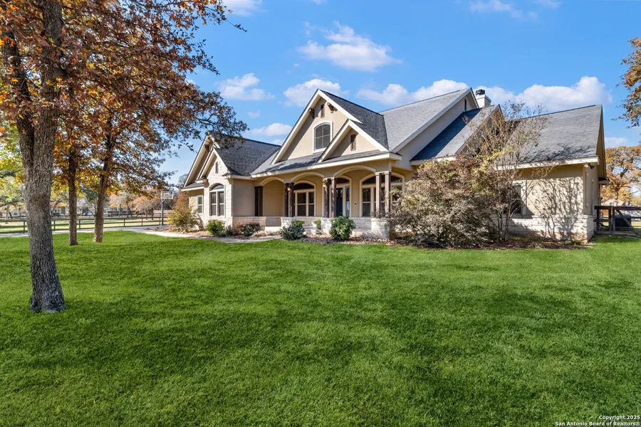Nestled on a serene 1.23-acre cul-de-sac lot surrounded by mature trees, this exquisite home offers privacy, sophistication, and resort-style outdoor living in the highly coveted Woodlands subdivision. Step onto the welcoming spacious front porch, and enter a home where high ceilings and wide open living spaces create a bright and airy ambiance. The open-concept layout flows seamlessly into a gourmet kitchen outfitted with granite countertops, custom cabinetry, ample storage, stainless steel appliances, and a large island bar ideal for casual gatherings. Elegant tile and wood flooring run throughout the home, adding warmth and timeless style. The primary suite is a true retreat with private outdoor access, and a spa-inspired ensuite bathroom featuring an oversized walk-in shower, island garden tub, and luxurious finishes. Three generously sized secondary bedrooms, a flexible dining room or office, and an oversized utility room with a sink and additional pantry provide functionality and flexibility for any lifestyle. Designed with entertaining in mind, the outdoor spaces are nothing short of extraordinary. A large covered outdoor living room with a fireplace invites year-round enjoyment. The custom-designed 32-foot lap pool combines luxury and fitness, framed by lush tropical landscaping and a tranquil waterfall feature. Just beyond the pool, a turfed seating and dining area leads to a show-stopping outdoor kitchen, fully equipped with gas cooking, a sink, refrigeration, custom countertops, retractable electric and USB outlets, outdoor lighting and a brand-new full-size pizza oven! Two additional buildings enhance the property's versatility including; a workshop with a garage door, ideal for hobbies or storage; a large storage shed; and raised garden beds for growing fresh produce. This is more than a home-it's a lifestyle estate with every feature thoughtfully designed for comfort, elegance, and entertainment. Whether you're enjoying morning coffee on the porch, swimming laps under the Texas sun, or hosting unforgettable outdoor gatherings, this rare property offers it all.