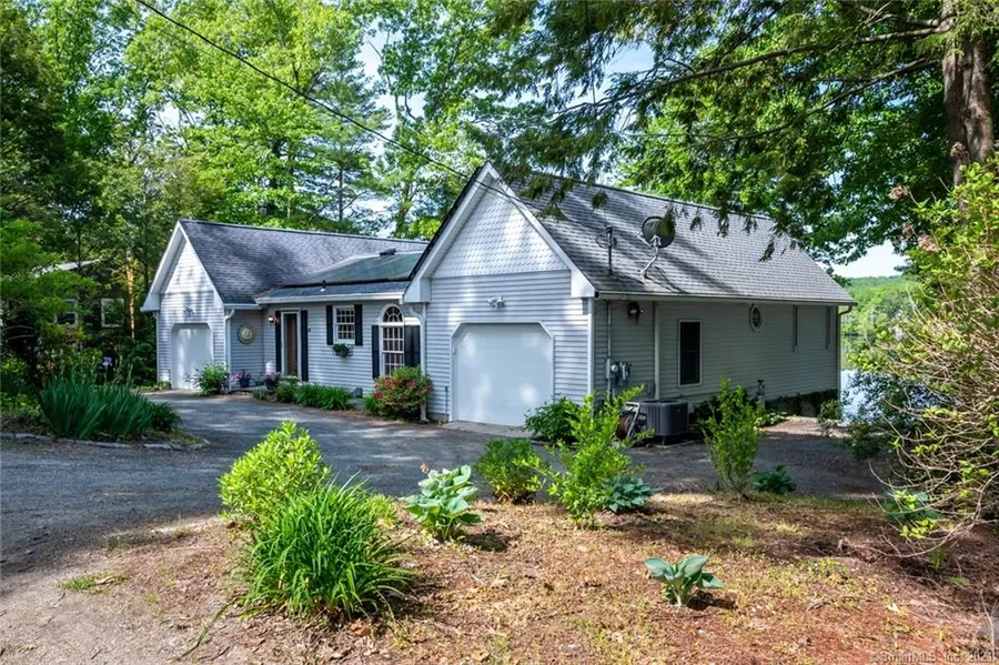 Absolutely breathtaking four-season home with direct frontage to Lake Bungee. This exceptionally well-maintained property features two living areas (each with its own kitchen), patio, and second-floor porch with unobstructed lake views. A dramatic stone fireplace, gas stove, and high ceilings in the main living area add elegance and charm. Move right in, as the owners have invested in solar panels (paid in full - no lease), an on-demand generator, and updates throughout the home. A private dock and boat launch make boating and swimming a breeze. Lake Bungee offers boating, kayaking, fishing, ice skating and more. Truly year-round recreation and relaxation 50 minutes from Hartford with access to New Haven and Boston.