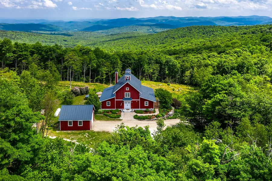 Perched on 4.5 acres bordering State Forest on sought-after Andover Ridge, this custom post and beam has been handsomely appointed and well maintained by its original owners. The front entry is warmed by hand painted walls and wood from a 19th century barn. French doors open into a great room with cathedral ceiling, a striking bluestone fireplace, and a panoramic view to Mount Monadnock. The open kitchen has Shaker cherry cabinets and granite counters. An adjoining mudroom with side entrance keeps your ski gear out of the living area. The light-filled office/studio leads to a cozy screen porch. A wraparound deck has Adirondack chairs where you can lounge with a drink and a good book, an umbrella table and chairs for al fresco dining, and a hot tub for relaxing under the stars. The private master suite is above the entry, and the main and lower floors each has a bedroom with Jack and Jill...