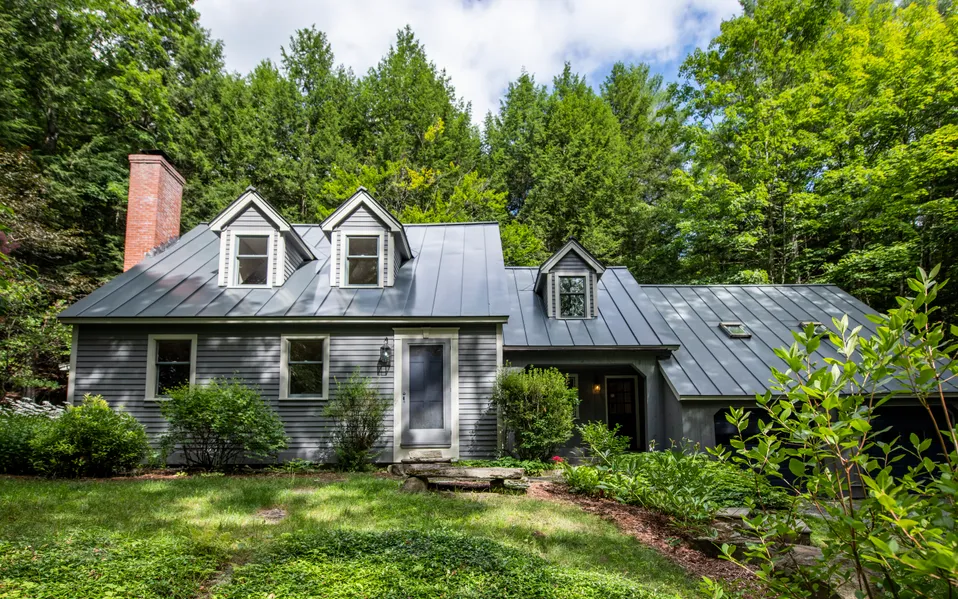 Quechee Green Oasis: Handsome and charming Contemporary Cape tucked into the forest on 2.59 acres. Around the property, one will fall in love with all of the stone walls, stone steps, and mature plantings. A charming kitchen that allows for a wonderful flow to entertain guests or live spaciously. The large green granite island, low green granite prep area, Corian counters, beautiful pendant lights, and large picture window are just a few aspects that enhance this kitchen. The fireplace in the living room seamlessly brings the outside in while admiring the stonework and additionally, the granite hearth and wooden mantle complete this cozy space. Throughout the house, there is an excellent melding of outdoor and indoor life in many different ways. Enjoy the screen porch off the dining room, or step out onto the large deck with bench seating off the kitchen, or prefer to sit in the glassed-...