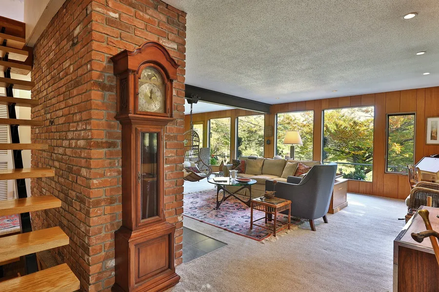 This gracious country contemporary, on the market for the first time, was designed and finished by its longtime owners, an industrial designer and an interior designer. Beautifully sited in a landscaped setting on a quiet country road, it enjoys distant mountain views and is protected on three sides by woods with nature trails. The 3 bed/3 bath interior is light and airy with plenty of living and working space including a bonus room used as a bunk room and unfinished space on the top and bottom floors allowing further expansion. There are distinctive and stylish touches exhibiting quality workmanship throughout, including floating stairs, custom built-ins, mahogany paneling in the open concept living/dining room, Saint Charles cabinets in the kitchen, a Rumford fireplace built with vintage bricks, a whirlpool tub, sauna, a workshop space and a darkroom that could be an artists studio or ...
