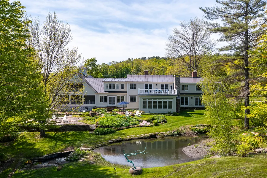 Upper Farm- Circa 1799, this generously sized antique cape is situated on 12 acres with a stream meandering through, multiple ponds, and stunning waterfalls overlooking a large meadow. Beautiful perennial gardens encircle multiple stone terraces overlooking a well-established apple orchard with several varieties of apples. A two-level barn offers ample space for equipment storage or animals. A brand-new, heated, 3-bay garage with multiple car lifts can house up to 8 vehicles. The upper level of the barn hosts a handsome 1-bedroom apartment with a private deck. The primary residence was built with exceptional craftsmanship and features gleaming wide pine floors throughout. The expansive kitchen is fit for a chef with a large center island, stone counters with high end appliances, and a massive pantry with a half bath and one of three laundry rooms. The kitchen opens to an informal dining ...