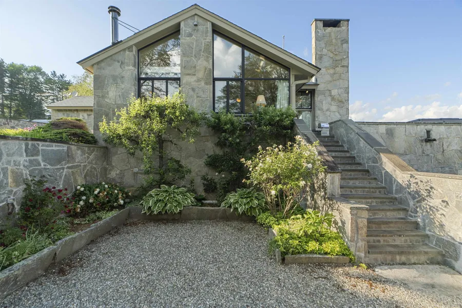 Skygate Farm is a historic Vermont farmstead first settled in the 1800s, which today spans over 300 acres of meadows, forests, trails, and weathered stone walls. The setting speaks of an early farmer’s wisdom — sited along a gentle hill to shield against the northwest winds, while opening to the first light of day and the vast mountain views to the east. Found at the end of a winding gravel road, the place offers complete privacy and a deep, restorative tranquility. In a later chapter, a mid-century modern stone residence was built to frame these views and capture the natural light—conceived as a summer retreat and a winter getaway for ski outings. Families gathered here for picnics at the top of the meadow, long swims in the clear, spring-fed pond, and walks along the trails picking blackberries. Inside, a silver movie screen drops from the ceiling for evening films by the fire. Custom closets store fly rods, skis, and gear for every season. Two wood-burning fireplaces bring warmth on cooler days. The deep, detached garage offers ample space for cars, equipment and tools. For the last 25 years, this haven has been a full-time residence. Bluebird houses line the fields, perennial gardens bloom seasonally, and flocks of goldfinch move through the meadows in waves. The land also offers potential for regenerative farming with 29 acres of open meadow and mature maples for sugaring. A solar array has 48 panels. Showings begin July 10