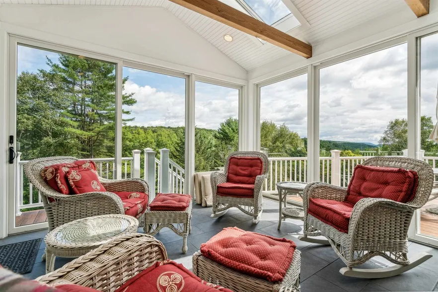Welcome to this private 4-bedroom, 6-bathroom home nestled on a quiet country road in sought-after Reading, VT just 4 miles from South Woodstock and close to the Green Mountain Horse Association. With Okemo Mountain only 30 minutes away and Killington just 35 minutes, plus world-class golf, biking trails and summer pastime amenities, this location is a four-season playground! This expansive home sleeps 12-14 comfortably and was designed with entertaining in mind. The updated kitchen with high-end appliances flows into a dining area and a bright, heated sunroom with pellet stove perfect for cozy gatherings. Two living rooms with fireplaces, a den, mudroom, and a bar area offer ample space for hosting. A first-floor ensuite bedroom and two additional first floor bathrooms provide convenience. Upstairs, the primary suite features a fireplace, private balcony, and luxurious soaking tub. Anot...