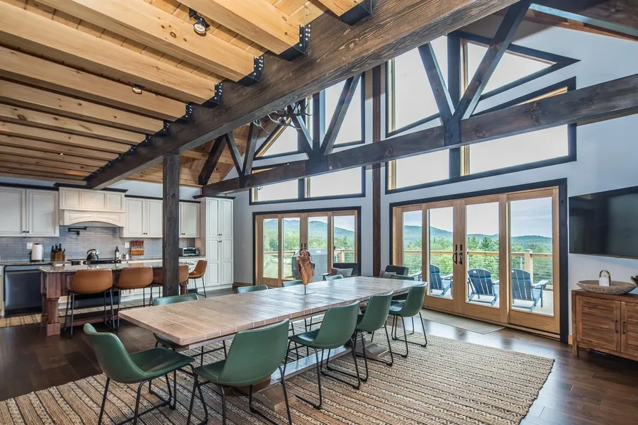 TIMBERS IN THE SKY – Featured in Log and Timber Home Living magazine, this one-of-a-kind Vermont timber frame retreat, built in 2022, blends dramatic architecture with refined comfort. Fully furnished with luxury pieces, the open floor plan showcases a soaring great room with vaulted ceilings, walls of glass framing breathtaking mountain views, exposed beams, and a striking tile gas fireplace. The chef’s kitchen offers stainless steel appliances, custom cabinetry, and a generous island, while radiant-heated Italian porcelain floors and rustic wood accents provide warmth and elegance. Four bedrooms and five spa-like baths include a stunning primary suite and a fun bunk room sleeping up to 14 guests with ease. Every bedroom has its own personality, and every bath is designed with a luxurious spa feel. Outdoor living is equally impressive. A huge covered deck with grilling area, hot tub, fi...
