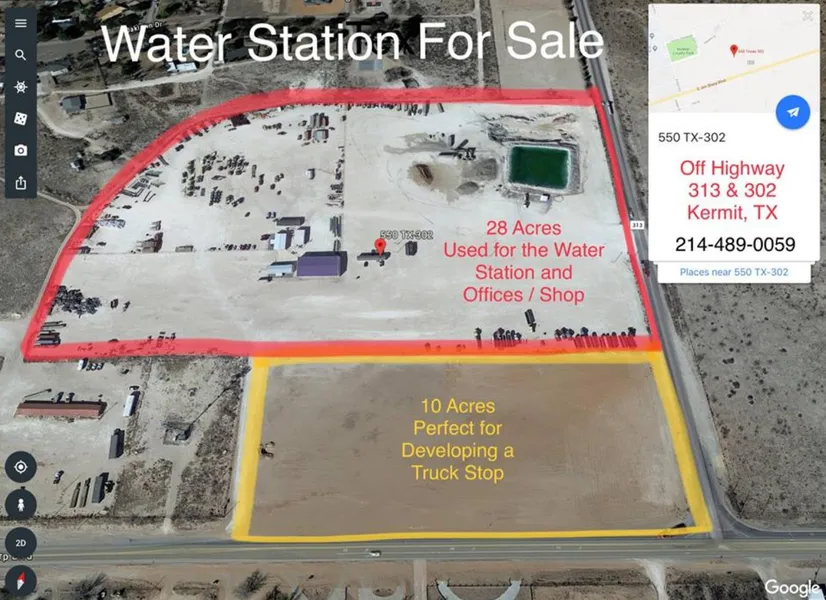 Located off Hwy 302 in Kermit Tx (Winkler County), sits a 28 acre land parcel being used for a Water Station. Oil companies and Frac Sand Producers in the area line up to buy fresh water 24/7. The owners generate $80K-$100K of gross profits per month and $27K of that is generated from the leases they have on the offices and shop. Selling Price is $5,500,000 and Seller Financing is available. Includes all the land, 4 structures, 4 wells, and the current water consumers/buyers/clients. Leases on the buildings are month to month, however, the new owner can choose to renew the leases or occupy the buildings themselves. One office alone generates $13,500 per month in rent. Owners are too busy to run the business anymore even though its a simple business with extremely low overhead. They are currently drilling another commercial well which will add even more profits to the business. As of right now, two commercial wells and a regular well are on the property. There are 10 acres of undeveloped land that would be perfect to develop a truck stop as another one is greatly needed in the area in the front of the property that is selling for $2,000,000. If you are in the oil / gas / frac sand / trucking business, you will want to look further into this property/business. Although Im a Real Estate Broker (#0454188), this listing will not go on MLS as it will be contracted very quickly. Buyer Agents are welcome. Angela Yaun - CEO/Day Realty Group - 214-489-0059 to Set up a Showing.