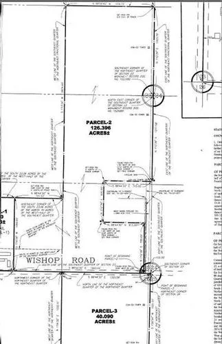 Three parcels make up the 166.4 acres. pin # 06-23-400-006 86.4 acres pin # 06-23-200-003 40 acres Both located to the north of Wishop Rd parcel 2 of the survey. Pin # 06-26-200-002 40 acres on the south side of Wishop parcel 3 of the survey.