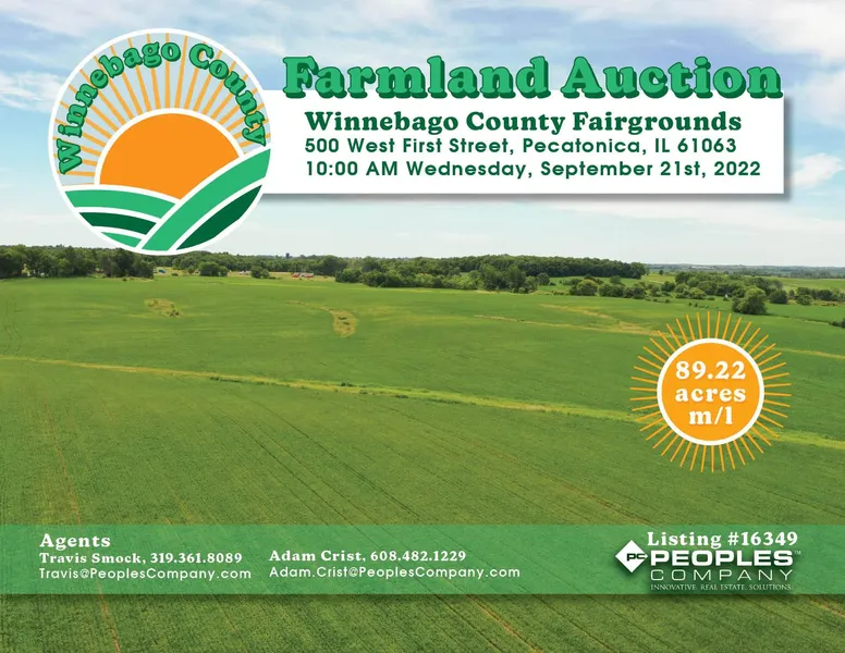 Peoples Company is pleased to present 87.21 acres m/l of excellent quality Winnebago County, Illinois farmland located just south of Pecatonica along Highway 20. The farm will be offered at public auction in one individual tract on Wednesday, September 21st at 10:00 AM Central at the Winnebago County Fairgrounds in Pecatonica, Illinois. The farmland is considered all tillable with a Productivity Index of 110.7. The major soil types are Griswold loam and Rockton and Dodgeville soils. With long straight rows, rich soils, and future development potential, this farm would make a great add-on to an existing farming operation or a smart investment for the Buyer looking to diversify their portfolio. The farm has frontage along Highway 20 and Grove Road and is located in Section 6 of Pecatonica Township, Winnebago County, Illinois.