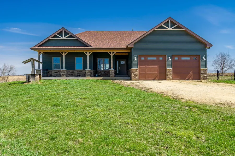 This 2-year-old Ranch style home with 2 bedrooms and 2 full baths on 7 acres is located in the Winnebago School District and is waiting for you! From the covered porch, you walk in the front door right into the living room and kitchen with wood floors, walk in pantry, granite countertops and a huge granite island! The Master bedroom has it's own bathroom and massive walk-in closet! The Master bathroom has a soaker tub, walk in shower and double vanity. The second bedroom is down the hall next to the second full bath. The dining room is right off the kitchen and has lots of natural light. The first floor laundry room is near both bedrooms and makes laundry a breeze! There is a radon mitigation system, egress window and is set up for a bathroom so you can finish it to your liking! There are also outbuildings for plenty of storage. The 2 story barn has a game room on 2nd story and a bar are...