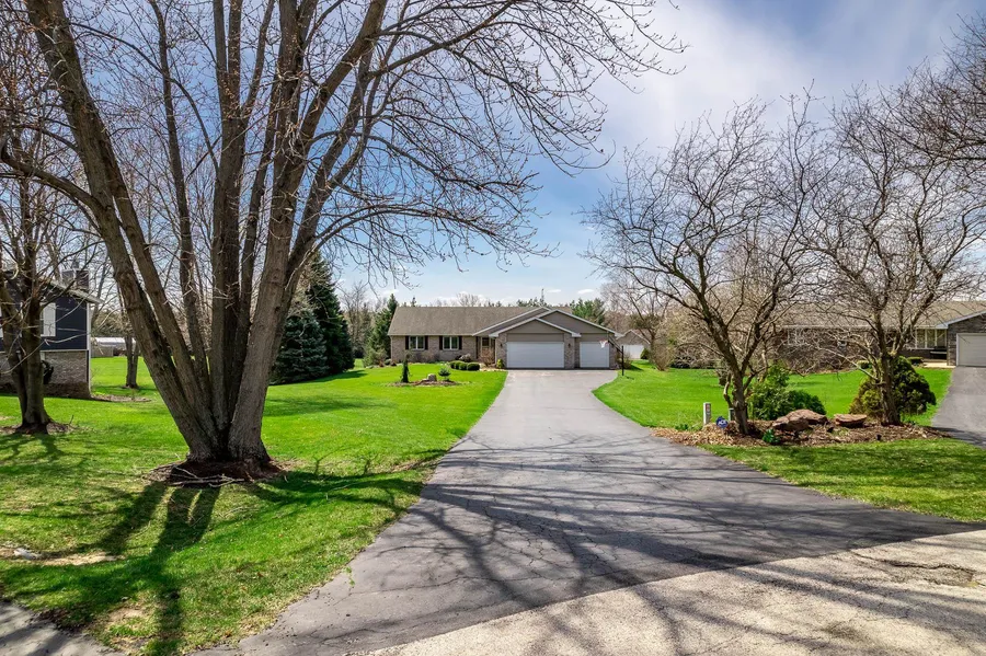 SHARP!! Updated 5 Bedroom Ranch with walkout lower level! Featuring approximately 2700 sq.' of living space in a highly sought after cul-de-sac location. Situated on nearly 2 acres, this lot has a deep tree line providing a park-like view from the house. The graceful sweeping sidewalk to the front door showcases the landscaping. Expansive & open floor plan fits today's lifestyle perfectly. Great room has a beautiful wall of windows overlooking the backyard, and the striking gas fireplace with tile surround makes this the perfect gathering area. The great room is open to the dining room which boasts built-in cabinetry and flows to the newer professionally designed & remodeled kitchen. You will love the white cabinetry, subway tile backsplash, quartz countertops and stainless steel appliances! There is an abundance of counter/prep space, pantry and additional seating that can be added at the end of the island. First floor laundry and Ž bath are just steps away from the kitchen. Three bedrooms on the main level include a spacious primary suite with a wonderful view of the yard, exciting feature wall, walk-in closet with wood wardrobe organizer. The primary bathroom has a heated granite floor, double sink vanity, tub and tile shower with glass enclosure. Two additional main floor bedrooms and full bathroom. The lower level features a large rec room with full walkout to concrete patio. There are two additional bedrooms and 1 full bathroom in the lower level along with a large, unfinished storage area with a staircase to the garage. Off the kitchen is an all-windows 3 season room that leads to a top-of-the-line Azek zero maintenance deck and covered outdoor kitchen perfect for entertaining. The outdoor kitchen has granite counters, kamado-style charcoal cooker, Summerset gas grill, side burners, and cabinet storage for all your outdoor cooking essentials. An additional 32' x 26' building on the property has a 17' x 8' overhead door with an opener and a steel security door for people access. The outbuilding has water and 100 amp electric service, including 220v and 110v outlets, Ring camera/motion lighting and Ring Wi-Fi repeater. The reinforced floor has 27‹? thick continuous footings and is 6‹? thick in the field, so it can support whatever vehicle you park in it. Existing orchard and garden ready for planting are located near water source. Updates include: Roof approx. 2013/kitchen, living, bedrooms, and baths remodel 2020/furnace, central a/c & water heater 2019. Kitchen refrigerator, dishwasher & gas stove approx.2019