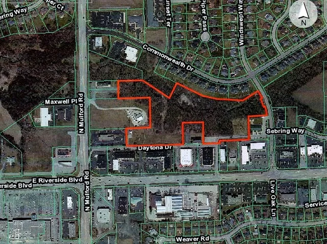 12.3 Acres. Zoned for multi-family / storage units / offices. Additional access possible from N. Mulford Road. Creek runs through with partial flood zone area. Could be divided.