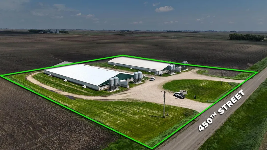 These swine facilities are located in Winnebago County, just North of Thompson, IA. These barns sit on 3.85 +/- Acres, have single phase electricity, and a newly rebuilt 100 KW Generator. They were built in 2006, have [2] 101' x 192' barns, and holds 4,800 head total. Each barn has a 900,000 gallon pit with an annual production of 1,045,310 +/- gallons total between the 2 barns. Records show manure tests of 56.7lbs Nitro/1,000gal [on average].