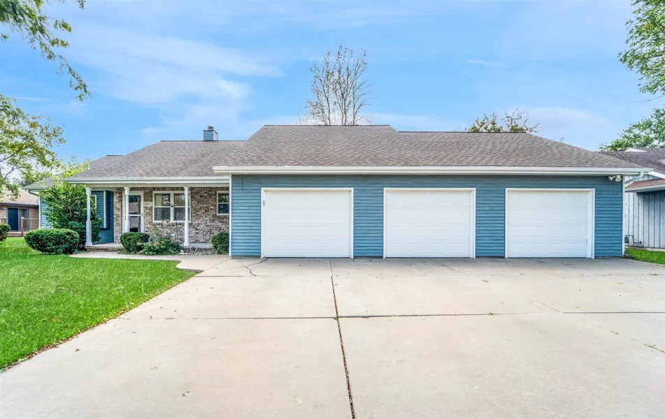 This light and bright split bedroom ranch has much to offer! Covered front porch greets you and opens to the expansive eat-in kitchen stocked with cabinetry, ss appliances, and ample dining space. Cathedral ceilings flow from the kitchen to the GR washed with windows! Floor to ceiling brick faced wood burning fireplace anchors the GR and sliding doors to patio frame the mature landscaped backdrop. Off the GR are 2 ample bedrooms split by a common full bath. The primary bedroom tucked off the back includes a private bath and walk-in closet. Additional features include: ff laundry, 3 car heated garage, finished LL with HUGE entertainment space with sink & cabinets, room with egress window could be finished for 4th bedroom, and much more!