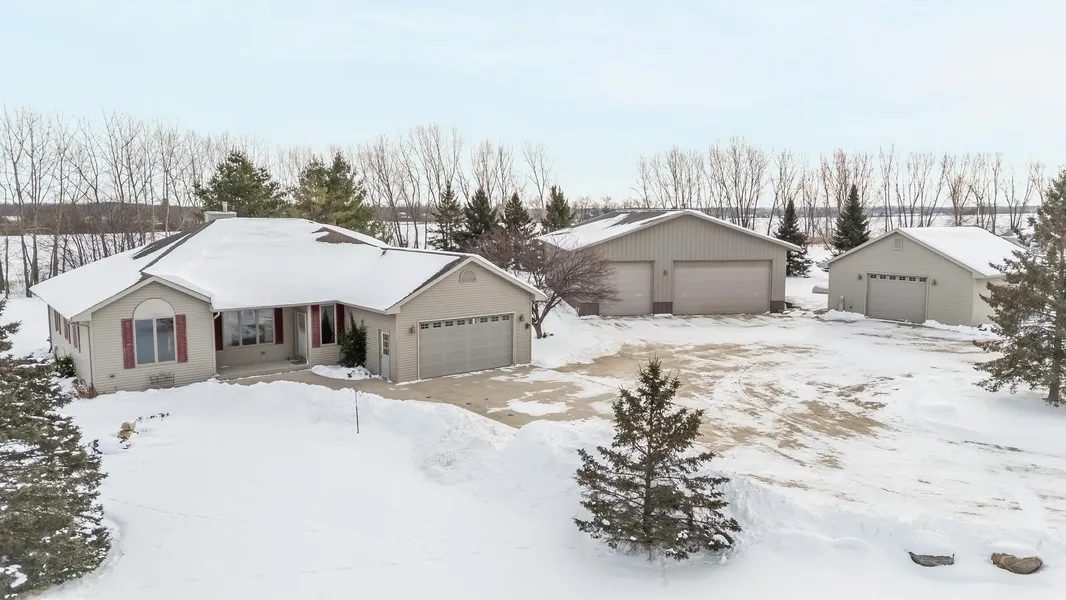 Peaceful country living with space to spread out. Incredibly well maintained 4 bedroom, 3 bath ranch nestled on a spacious 3.5 acre lot. You'll love the inviting sunroom that fills the home with natural light and offers stunning views of the property. Step inside the open kitchen area and see the two way gas fireplace creating a cozy warm space. The lower level boasts a finished room great for entertaining plus a bedroom and full bath. Outside there's room for everything, a massive 40x80 outbuilding providing endless possibilities for storage, hobbies, or a business, plus a 28x32 heated building with a cement floor for a workshop. At night relax around the fire pit area or enjoy time on the newly renovated deck and take in the wildlife. Please note the finished lower floor is painted