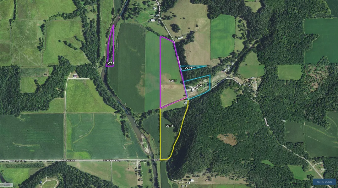 Lot #1: 26 acres +/- with 23 acres of tillable farm ground. This tract has great access off the west side of Scenic River Road, with a well-maintained field drive. Thi...