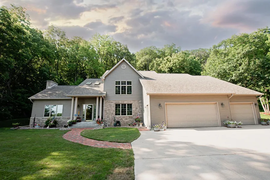 Beautifully maintained house and yard overlooking the Mississippi river. 2 story open entry way with sky lights. 3 bedroom, 3.5 bath house has room to add a 4th bedroom in the basement. Main floor livingpossible with primary bedroom/bathroom and laundry on 1st floor. Huge eat-in-kitchen with lots of cabinets. Extra large living room with fireplace and vaulted carsiding ceiling. Full basement has familyroom egress window for possible 4th bedroom, 3/4 bath, bar with mini fridge, huge storage utility area and stairs that lead to 3 car garage and work room. Private deck off kitchen for outdoor entertaining.