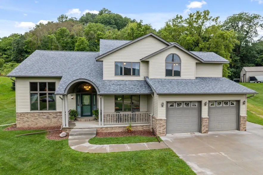 Within the 9-inch exterior walls of this custom-built 3-bed, 4-bath home, you'll find thoughtfully designed spaces. An office, recreation room, family room, formal dining room, and eat-in breakfast area offer plenty of living space, with large rooms and walk-in closets throughout. The kitchen is beautifully appointed with a pantry and sleek black stainless steel appliances. Upstairs, the primary bedroom features an ensuite bathroom and a spacious walk-in closet. The basement recreation room has egress windows for added light and safety. Outside, enjoy the front porch and new back deck. This home sits on just over 18 acres, backing up into the bluffs, with stunning views in every direction. With an attached 2-stall garage plus a large detached workshop/garage, you have plenty of space to protect several vehicles. This gorgeous move in ready home, has brand new carpet, new siding, new roof, and two fireplaces, this property blends comfort and natural beauty perfectly.