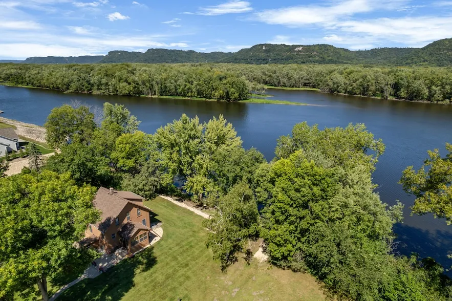 One-of-a-Kind Riverfront Property that boasts 50+ acres of ponds, scenic trails, a private boat landing, & a versatile, removable dock system with a jet ski port. Offering unparalleled easy access to the Mississippi River. Recent upgrades include a newer forced air furnace, water softener, central air conditioning, updated shingles, and appliances. Spacious Six-Car Garage: Featuring a newer furnace, a convenient kitchenette, & a custom-made ten-by-nine-foot hangar door. Perfect for storage & projects. Additional Living Space Above the garage, a beautifully handcrafted finished space adds approximately 430 square feet. This area includes a cozy loft, stunning red elm floors, maple ceilings & walls, & custom doors. Embrace the tranquil beauty of this remarkable riverfront retreat.