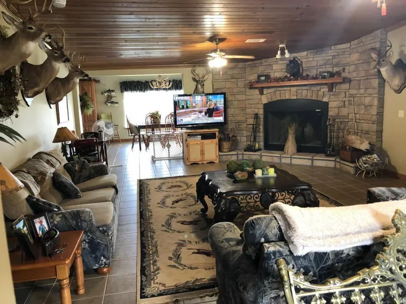 This has been a well managed whitetail and turkey hunting property for many years, 10 pt or better and limit out on turkey. Watch deer and turkey from the deck of your 4 BR 4 Bth cabin overlooking big open fields. Shooting houses are located on each food plot and ladder stands and tripods are located strategically throughout the property in hardwood bottoms and draws for some great bow hunting. Clear Creek flows through the the property for a great water source for wildlife. There are a few bluffs and caves around the creek that has produced many arrowheads. A large pond on the property as well. Property also has a tractor shed and storage for your implements. Cabin is over 2400 sq ft and can host a large group. Has city water, electricity, internet, and DirecTV. Call for private showing.