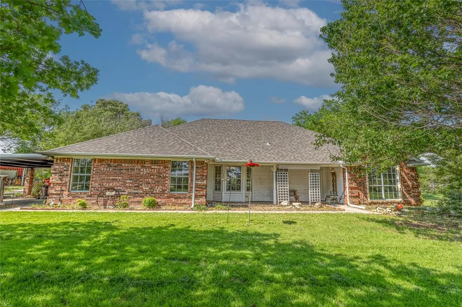 This serene countryside property with privacy and mature trees, situated on a corner lot on a cul-de-sac without any known deed restrictions, boasts 3 BR, 2 BA, 2408 SF of living space which includes an approximate 20 x 20 garage conversion into a spacious family room, new vinyl plank flooring throughout, stainless steel appliances, dining area with a bay window, utility room, vaulted ceilings, large bedroom windows, crown molding, ceiling fans, wood burning fireplace and a covered carport. Nestled on 2 acres of land, with endless possibilities, the property features a 3 car garage-shop and three sheds, with one shed designated for housing the irrigation system. Community water well. All located in Paradise ISD.