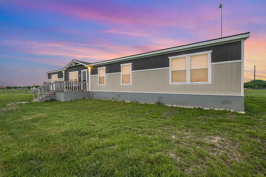 This lovely home with SOLAR PANELS, sits on sprawling green acreage perfect for those craving peace, space, and a small-town charm. With no HOA, wide open skies, and room to roam, it's easy to embrace the slower pace and simple pleasures of life. Step inside where you're immediately greeted by a spacious open-concept living room. Natural light pours in through a multitude of large windows, highlighting the stunning wood-look flooring and modern farmhouse finishes. The thoughtfully designed kitchen is truly the heart of this home. There is an expansive island with bar seating, rustic accents, and ample storage. Stainless steel appliances and wraparound windows make it bright, functional, and ideal for entertaining. Just off the kitchen is a cozy dining area, built-in wet bar with an additional sink, and a barn door that opens to a generous pantry. Sliding glass doors lead out to the expansive back porch and the Texas sunset. The attached primary en-suite bath features contemporary finishes and an oversized walk-in shower with double waterfall shower heads. Tucked away down the hall, there is a secondary living space complete with built-in shelving and cabinetry, adding warmth and texture. Each additional bedroom is bright and airy, with massive windows that showcase sweeping views. The laundry room combined with the mudroom add function and convenience including a utility sink and more built-in storage. Outside, explore endless possibilities while enjoying country living with modern energy savings. Gardening, sipping coffee on the deck watching the sun rise or fall, this property is an escape from the noise of the city. Live the cowboy way-in comfort and Texas tranquility.