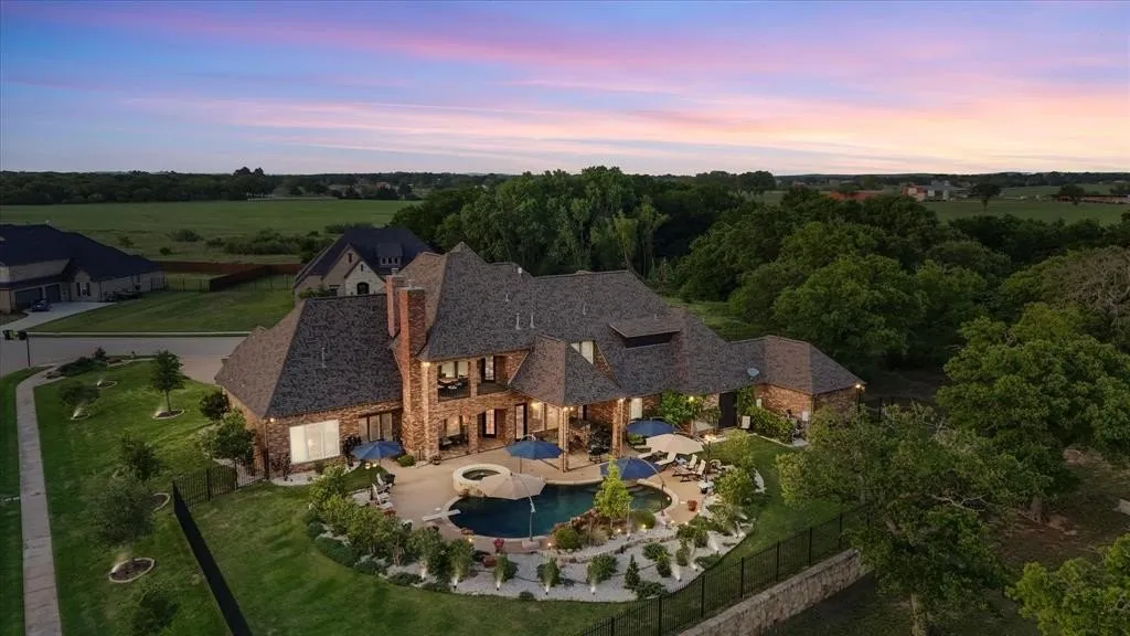 Discover a home where upgrades abound & outdoor living shines. Savor morning coffee by the patio fireplace on crisp winter mornings, entertain guests at the well-equipped outdoor kitchen, or cool off in the stunning lagoon-entry diving pool with waterfall & hot tub. Take a leisurely stroll through the park to the lakes for fishing with family, and don’t miss the breathtaking sunsets! Exquisite Craftsmanship throughout, Spanning 5,513 square feet, this 6-bedroom, 5-bathroom masterpiece offers unmatched versatility, including a private attached apartment with a separate entrance, featuring 2 bedrooms, a living area, full kitchen, bathroom, and exclusive access to the 4th garage space—ideal for a live-in caretaker, mother-in-law suite, or multigenerational living. The chef’s dream kitchen boasts top-of-the-line stainless appliances, including Sub-Zero refrigerator, Dacor 6-burner gas range with dual ovens & pot filler, quartz countertops, two large islands, two sinks, and a built-in wine cellar with butler’s pantry. Elegant finishes elevate the home, with rich hardwood floors, crown moldings, vaulted ceilings, and a striking wrought iron staircase. The spacious primary suite offers direct pool access, a luxurious bathroom with ample vanity space, and walk-in closet with impressive built-ins. Entertain in style in the upstairs theater-style media room, game room with wet bar, and cozy balcony porch. The thoughtfully designed 1st floor includes the primary and guest suites, formal study, dining room, living room, kitchen, mudroom, & 2nd private study off the laundry. Rare features provide peace of mind, including a whole-house reverse osmosis system, emergency generator, and fire sprinkler system—perfect for worry-free living, whether at home or traveling. With easy access to Highways 114 and 287, enjoy quick commutes to Fort Worth and DFW while relishing peaceful, laid-back living without the congestion. Inside and out, this home is designed to impress!