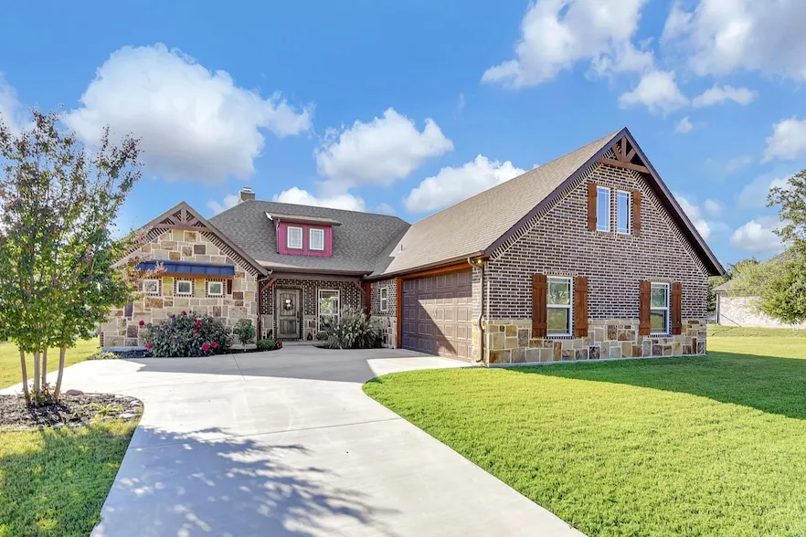 Stunning single-story, like-new custom-built John Schedcik home on 1 acre in highly rated Paradise ISD, offering beautiful wooded views. The exterior boasts striking Oklahoma multicolored cut stone and rock for timeless curb appeal. Inside, the gourmet kitchen features stainless steel appliances, granite countertops, decorative lighting above the island and breakfast nook, and the refrigerator stays. A formal dining room showcases a coordinating chandelier, while the living room highlights tall vaulted ceilings, a floor-to-ceiling stone fireplace, built-in cabinets, and cozy built in seating. The spacious primary suite offers tray ceilings with wood accents, windows for natural light, and a luxurious ensuite with a walk-in shower, freestanding tub with frosted window, dual vanities, built-in cabinetry, and expansive walk-in closet with shelving. Two additional bedrooms provide flexibilit...