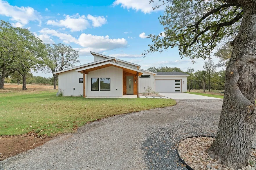 Nestled among towering trees on a serene 1.79-acre lot, this 2,200 square ft mid-century modern, Hayhurst Brothers crafted home seamlessly blends timeless design with modern comfort. Showcasing a signature butterfly roof and clean architectural lines, this 3-bedroom, 2-bath home offers style, functionality, and room to breathe. Step inside to an open floor plan featuring vaulted ceilings, expansive windows, and bright, airy spaces that bring the outdoors in. The spacious living and dining areas flow effortlessly, perfect for entertaining or enjoying peaceful evenings at home. Each room is filled with natural light, highlighting the thoughtful design and warm ambiance throughout. The home also includes a 2-car garage and sits tucked away in a quiet, country setting while still just minutes from city conveniences. This is where modern architecture meets tranquil Texas living. Hurry out to see this one of a kind home before it's gone!