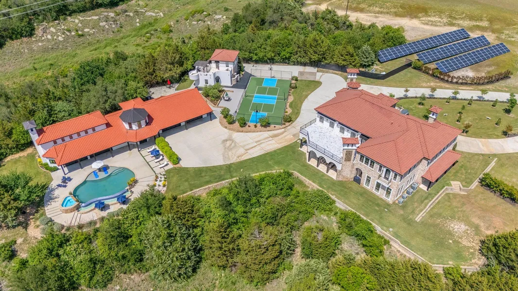 A must-own! Extraordinary estate on 25 acres filled with luxury and excitement! This special property boasts three full homes: A lavish castle (8,200 sq ft), a stunning cliffside home with resort-style pool areas and breathtaking cliff views, and a charming European-style villa with private balcony. Together, they offer approx. 14,000 sq ft of living space, 9 bedrooms, 12 bathrooms, 4 living areas, 5 kitchens, a library, an executive office, home theater, a wine bar, 5 fireplaces, and balconies with extraordinary views. Support buildings include a 6-car garage, a 5,000 sq ft hangar/barn with a 2-bedroom, 1-bathroom apartment. Outdoor features: pool/spa, driving range, putting green, a multi-sport court, a custom playground, a hen house/pen, and a helicopter pad. Systems features: solar farm, multiple propane tanks, commercial-grade appliances, and premium finishes throughout. This remark...