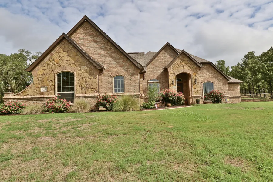Fantastic nearly new 4br/2.5ba/3 car garage + offfice Custom built brick & stone home in the country! Great open floor plan with vaulted ceilings, beautiful granite counter tops, tile floors. Impresive master bath with double entry walk thru shower and large garden tub. Massive walk in closet & lots of storage. Survellance Security System. Outdoor kitchen under covered patio. Insulated & heated 30x40 shop. Wonderful landscaping, lots of Oak trees and cross fenced back yard for pets on almost 2 acres.
