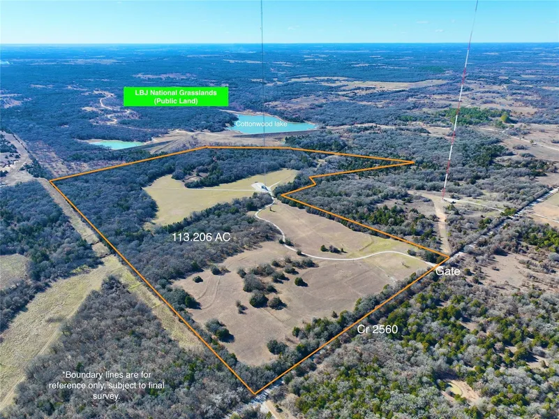 Located just below Cottonwood Lake and surrounded on 2.5 sides by the LBJ Grasslands, this 113 acres has beautiful pastureland mixed with great oak trees provides the ultimate recreational property. Excellent scenery is provided by Cottonwood Creek winding through the heart of the tract. Wildlife are plentiful and could be considered an excellent selling point for a hunting enthusiast or nature lover. Varied terrain also would allow for putting a house on a hill in the future to capture views of the highly desired area only 15 minutes northeast of Decatur. An older homestead that has been vacant for an unknown time is also located in the property. Very little is known about it and no value is added to the asking price on its behalf. A large cell tower is located near the center of the property which will maintain an easement for access and maintenance. Multiple Offers, Offers are due by ...