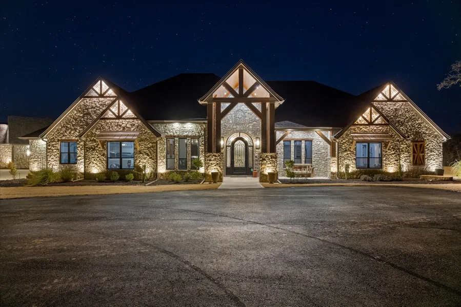 This extraordinary custom estate offers the perfect blend of luxury living and natural beauty, nestled among mature trees on over 49 pristine acres.The magnificent main residence spans more than 6800 sqft featuring sophisticated design elements including cathedral ceilings, exposed wood beams and hand-scraped hardwood floors throughout.The main residence features a distinctive stone exterior with two elegant fireplaces creating warm and inviting spaces to gather.The kitchen is open to the living room and has a built-in fridge freezer, walk-in pantry, double ovens and spacious island.The outdoor patio is off the kitchen and has a wall of sliding doors for natural light.The primary suite is spa-like with dual vanities, soaking tub, multiple shower heads and 2 walk-in closets.The family room invites you to host guests at the wet bar with dedicated seating perfect for entertaining. Laundry features tons of storage, dog bath and space for double washer and dryer.Home also has a safe room.The estate's covered outdoor space rivals its interior amenities with an integrated speaker system, cooling fans, heaters, built-in grill, sink, fridge, bar area along with strategic landscape lighting. Over 2024sf of outdoor living. Attached by a porta cachet is a luxurious guest quarters with an attached garage.Separate 2B, 1B, cabin provides perfect accommodation for guests with privacy while maintaining proximity to the main residence.The 6 garage spaces have HVAC and around 2266sf.Property is ready for your livestock and horses with 10 separated pastures,10 loafing sheds with electric and water,10 working pens with water and shade coverage, large covered shed 60x25, equipment shed 15x20, hay shed with electric and a chicken house.There is also a 30x60 shop with HVAC, full RV hookup with water, electric, and sewer connections.The property has 2 entrances and a perfect location for your dream arena.We have a bid for a proposed arena that is 250X250 with stables.45 minutes to DFW airport. Note - First 9 interior photos are of the guest house.