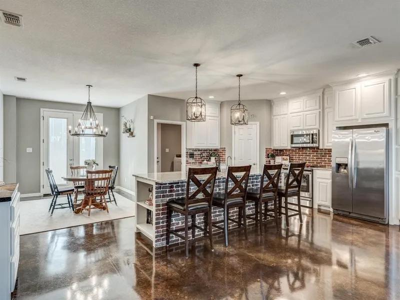 Stunning barndominium built in 2018 on almost 8 acres! It even comes with option to expand with its 2 septics for the growing family. This stunning home features lovely concrete floors throughout, a large island with space for seating and an eat in kitchen. It's open and bright floor plan brings the perfect touch of rustic modern together with decorator elegance. You will love the extra large laundry room! The perfect allocation of space gives you private spaces without being cut off and segregated. Includes spacious shed and so much room to add more along the way.