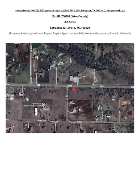 Prime .62-Acre Unimproved Lot in Decatur, TX No HOA, No Restrictions, Not in a Flood Zone! Seize this rare opportunity to own a .62-acre parcel of unimproved land in the thriving community of Decatur, TX. Perfectly positioned outside city limits, this property offers no HOA and no restrictions, giving you the freedom to build your dream home, barndominium, mobile home, or even an income-producing property. With no flood zone, you can develop with peace of mind, knowing your investment is secure. Enjoy the quiet charm of country living while still being conveniently close to Decatur s historic downtown, with local dining, shopping, and entertainment options just minutes away. Easy access to major highways makes commuting to Fort Worth and the greater DFW metroplex a breeze. Whether you're looking for a private retreat, a future homestead, or a savvy investment, this blank canvas is ready for your vision. Don t miss your chance to own a piece of unrestricted Texas land