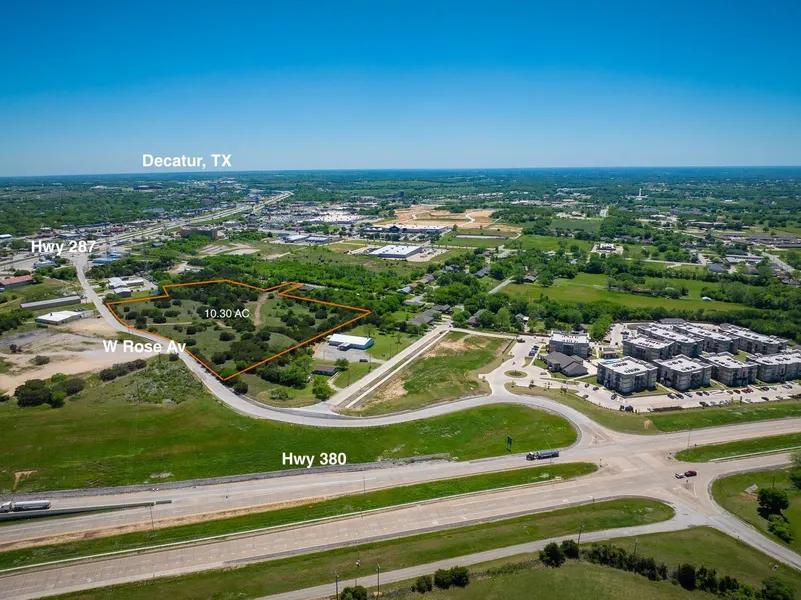 Located high on the hill, this 10-acre property offers views you wouldn't expect to see much less be able to own in Decatur, Tx. The potential for a residential and or mixed use development with prime commercial opportunities comes with the benefit of being in the heart of the opportunity zone. The majority of road frontage is along W Rose Ave with an additional 78 ft of road frontage along W Main St allowing for access from both the north and the south. The northern portion of the property along W Rose Ave has a fairly level area before dropping down almost 20 ft to a much more gradual sloping terrain where it is easy to picture the layout of a single-family development. Most of W Rose avenue is zoned for commercial use with some of the property being clearly visible from US-380. Whether looking at it from a development perspective, an investment opportunity, or a place to build a house with a view, the size and location of this property is a one of a kind.