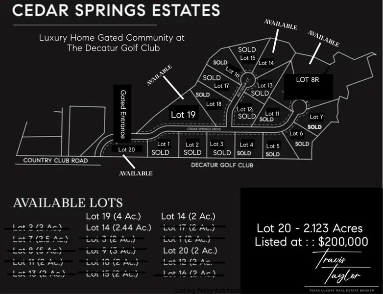 NEW LUXURY HOME GATED COMMUNITY IN DECATUR, TEXAS : Welcome to Cedar Springs Estates located on the Decatur Golf Club. Exclusive Custom Home Sites available for purchase starting at $200,000. Cedar Springs Estates offers a selection of unique amenities including direct access to the Decatur Golf Club and Club House, across the street from Hollis & Sue Jones Park and ball field's, as well as very close proximity to the Decatur Private Airport. Rest assured with extra level of security behind the community gates, Cedar Springs Estates is one of the few gated communities in Wise County. Play the 9 hole golf course, catch a ball game at the park, head to the private airport to get out of town all within a few steps of your home. A short drive to the Historic Downtown Decatur Square you will find fine dining and shopping. Enjoy privacy and seclusion on your 2+ acre lot surrounded by mature tr...