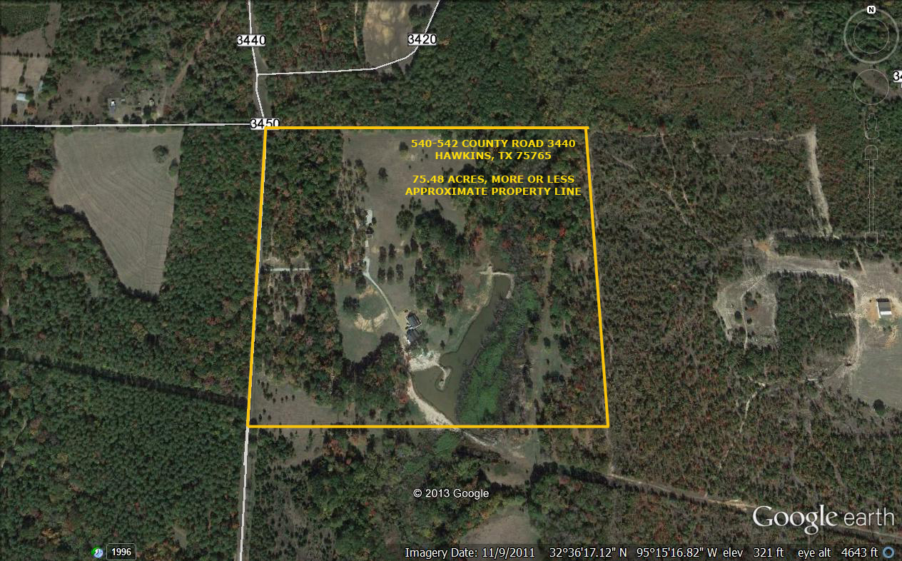 Have opportunity for two families to share and enjoy 75 gorgeous rolling acres just down the road from Lake Hawkins near Hawkins, TX. Solid barn-style home with 4 living areasgreat for kids, overlooks a spring-fed lake, 45X36 storage barn (for an RV) and a 45X30 equipment barn. Large covered patio to enjoy cookouts, family friends and the view. Lots of wildlife. Second home, also quality built in 2006, sells furnished and features 3 bedrooms, 3 baths and has 1656 square feet per tax rolls. Outdoor patio/deck under the trees, RV pad with all utilities and a 36X24 party barn with heating and air conditioning. Attractive security gate and lighted driveway. Hardwoods, pine trees and sandy soil.