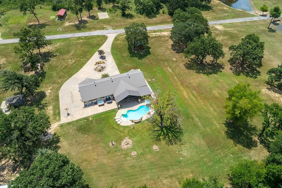 Happiness unlimited awaits you here at your very own Ponderosa. An open area of recreation and fun for the whole family. Outside you have almost 24 acres. There are two ponds with loads of fish waiting to be caught. The home sits back more than two football fields in length providing ample privacy. You have a horse arena that is approximately 150 ft. x 240 ft. There are stables that are approximately 40 ft x 60 ft. You have a huge 3000 sq. foot workshop. Currently, half of the workshop is used as woodworking and mechanical work. The other half is set up as a workout area, game area and man cave but can be used for whatever you like. There is a guest home that is approximately 15 ft. x 32 ft. with central heat & air to help you with any overflow from family and friends. You have an RV pad that is approximately 24 ft. x 40 ft. with electric, water and septic hook up. You have a storage shed and a loafing shed that is close to 20 ft. x 40 ft. If you need more storage space you have a log cabin close to the house that is around 12 ft. x 18 ft. For all of those people who want fresh chicken eggs, theres a chicken coop waiting for you to pluck fresh chicken eggs every morning. Then to top it off the back of the home has a huge, covered, entertainment area complete with a swimming pool that has a rock waterfall, a hot tub, lounging area with ceiling fans and outdoor lighting. The home itself is close to 2450 sq. ft heat/air. You have an open living area with the main room, dining room, breakfast bar and kitchen all as one. This area has crown molding, ceiling fans and a stone hearth fireplace with gas insert. The kitchen is open and bright. It has a wonderful breakfast bar and kitchen island. The kitchen has lots of cabinets, countertop space with down lighting and is appointed with stainless steel appliances. There are three bedrooms and two bathrooms. All of the bedrooms are carpeted. The master bedroom is approximately 260 sq. ft. and it has a ceiling fan and recessed lighting. The master bathroom has tile flooring, recessed lighting, linen pantry, crown molding, double lavatories, walk-in shower and garden bathtub. The guest bedrooms are comfortable in size and both have ceiling fans and crown molding. If you are needing to work at home, you have a private office with wood grain, laminate flooring and a ceiling fan as well. And lets not track all of the outdoors inside this home and you wont. This home has a great mud room coming in right from the garage. And speaking of the garage, it is approximately 22 ft x 23 ft and it has a wonderful craft room that is approximately 11 ft. x 11 ft., a storage room, and stairs to a walk up attic with tons of storage. If you like fishing Lake Fork. Guess what? You are only 3 miles to the public boat ramp on FM 515. Whew! Think this enough for you?