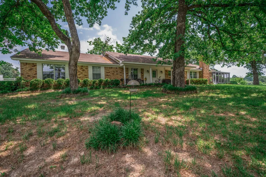Property sits up on a Hill with a Great View of Lake Hawkins from front porch. Also about an acre of pond with fish and if you get tired of fishing in the pond take a walk out on the county permitted spit and fish the lake. 2 covered carports to cover 4 vehicles. The 2nd building is a workshop or barn whatever you would like to use it for. 2 living areas both each have wood burning fireplaces to relax and enjoy in winter. We currently use one of the living areas as a dining room but it could easly be changed to a 2nd living area. The large primary bedroom has an awesome view of the lake. The 2nd primary is off of the kitchen with a sliding door for privacy. The 4th bedroom we currently use as an office. There is a bonus room that can be used for another office or storage it is off from the livingroom. The kitchen has a huge center island. There are no restrictions so you could raise chickens, goats, a couple of horses, etc. There is a well that we do not have in use currently. White fence surrounds the property except for one section in the back.