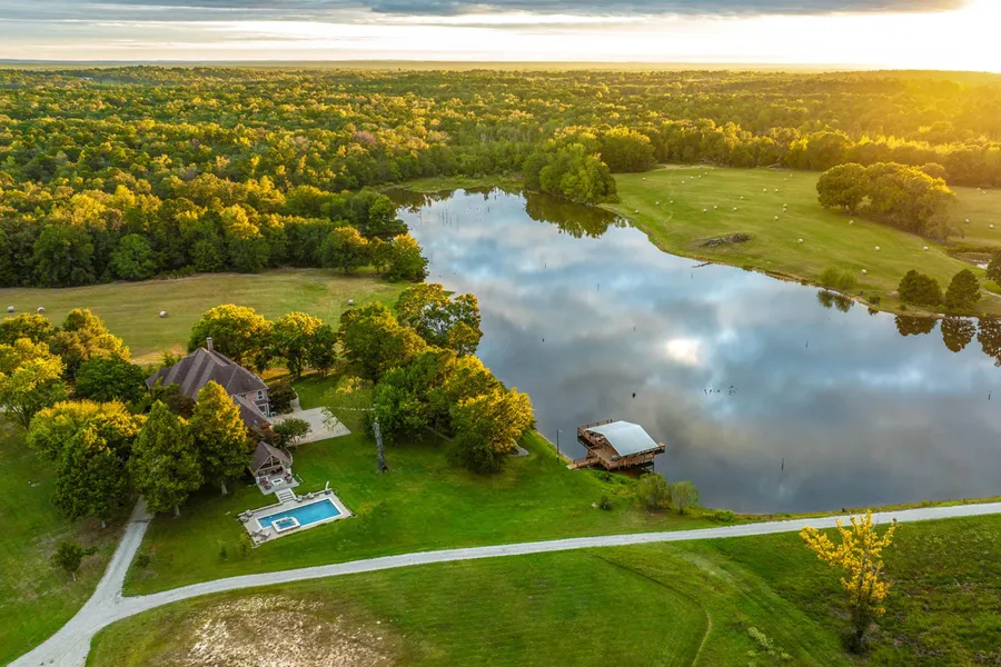 Woodland Ranch is a stunning 276-acre retreat in East Texas, featuring a main residence, three guest homes, and various recreational and ranching amenities. The property boasts a mix of lakes, ponds, open fields, and dense woods across rolling terrain, perfect for fishing, hunting, cattle grazing, and hay production.