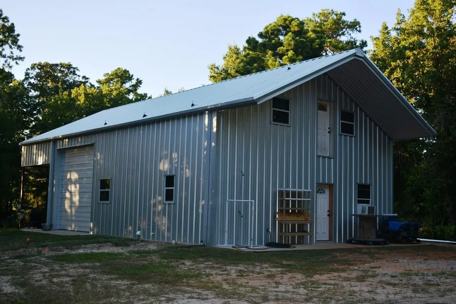 2017 CONSTRUCTION without starting from slab, This 2 bedroom 1 bath, Master down with guest loft bedroom, Barndominum on 21.585 acres is almost complete. All plumbing and electric in, hard stuff done, working on sheet rock, You will add the finishing details. Owner will give $2,000 flooring allowance, slab/concrete floors await your choice. Still under Construction. in sheet rock phase.