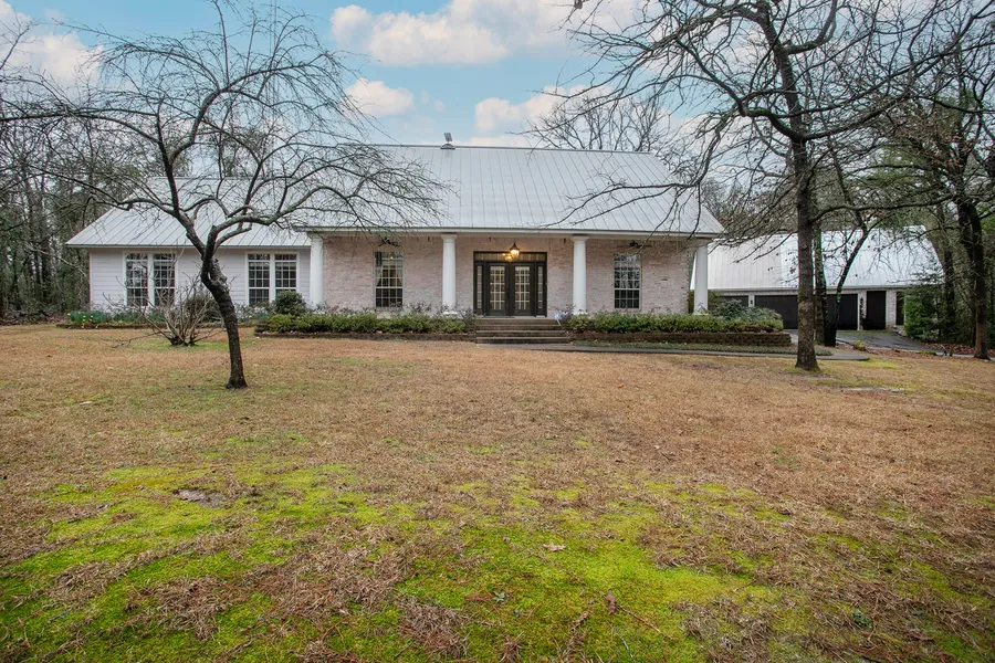Charming home tucked away among the piney woods of East Texas. 10 approximate serene acres, fully fenced with private gate. Embrace the refreshing panoramic views and southern charm with the large columns across the sweeping front porch. Highly desirable split bedroom with primary suite separate from two secondary bedrooms. Gorgeous kitchen with hammered copper sink and beautiful cabinetry. Additional pantry off utility room perfect for your small appliances and staples! The Great room features a remarkable floor to ceiling custom solid wood bookcase that is sure to make your heart smile, large windows, fireplace and half bath. Primary suite with separate bath and shower, dual sinks, water closet and walk-in closet. Screened back porch or sunroom overlooking backyard. Outdoor living space with fireplace, garden and more! Separate oversized 3 car garage with attached 1BR, 1BA guest suite....