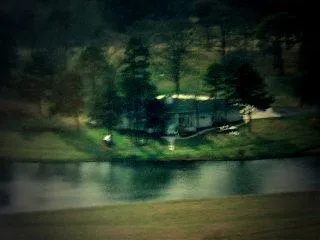reflecting light from the back porch decking. Massive stone fireplace surrounded by walls of windows in the great room with high ceilings and exposed beams. Large kitchen with tile counter tops, island, wet bar,eat in kitchen,and walk in pantry. 1200 sq ft Lake cottage up stream from the main house which has private pier and metal with living qtrs. Paved