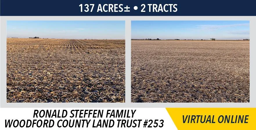 The Steffen farm will be sold on a price per acre basis, based on surveyed acres. Both tracts will be offered through the marketing method of Buyers Choice, whereas the high bidder can elect any of the tracts for their high bid. If the high bidder does not elect all offered tracts, then the remaining tract(s) will continue to be offered Buyers Choice until all tracts have been elected. The tracts will NOT be offered in their entirety at the conclusion of the auction.